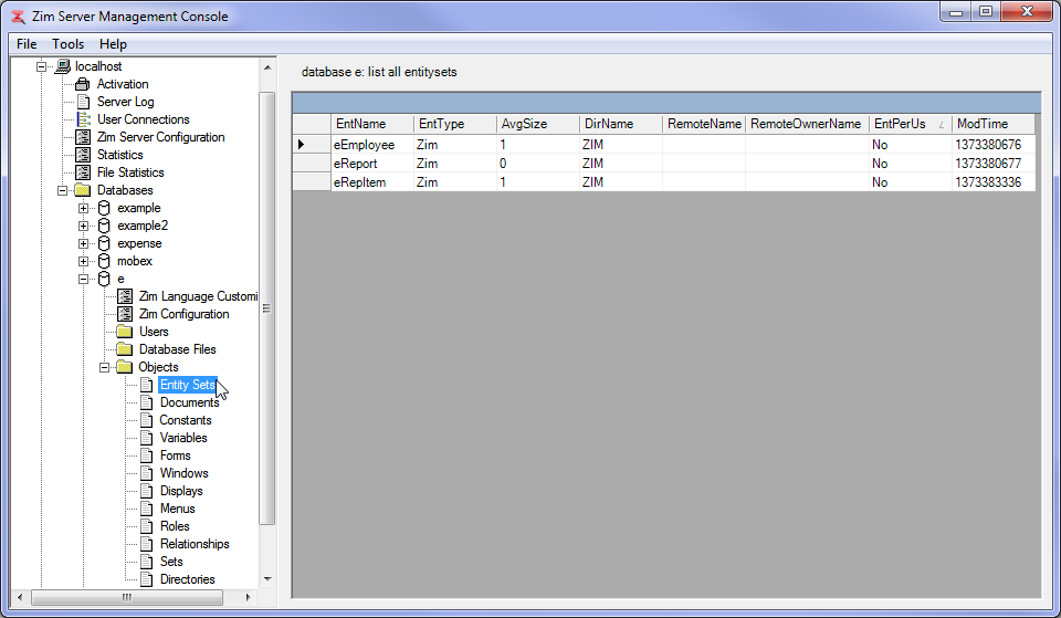 For example, the following image shows three objects of the Entity Set category in database e, with the properties EntName (eEmployee, eReport, eRepItem), EntType, AvgSize, etc. represented in the columns.